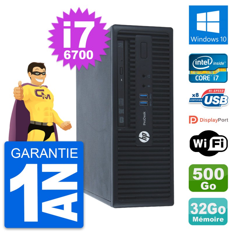 PC HP ProDesk 400 G3 SFF - Intel Core i7-6700 3.4 Ghz (8 Mo) - 32 Go DDR4 - Disque Dur 3,5" 500 Go - Graveur DVD - Clef Wifi USB - Windows 10 - Garantie 1 an.
