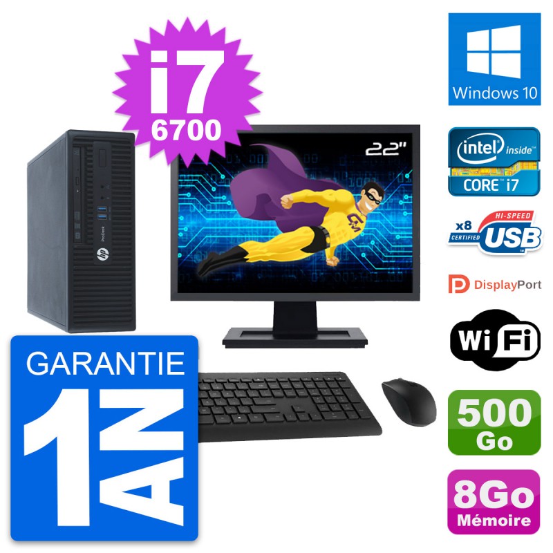 PC HP ProDesk 400 G3 SFF - Intel Core i7-6700 3.4 Ghz (8 Mo) - 8 Go DDR4 - Disque Dur 3,5" 500 Go - Graveur DVD - Clef Wifi USB - Windows 10 - Livré avec Ecran 22" + clavier + souris (Marques et modèles variables) - Garantie 1 an.