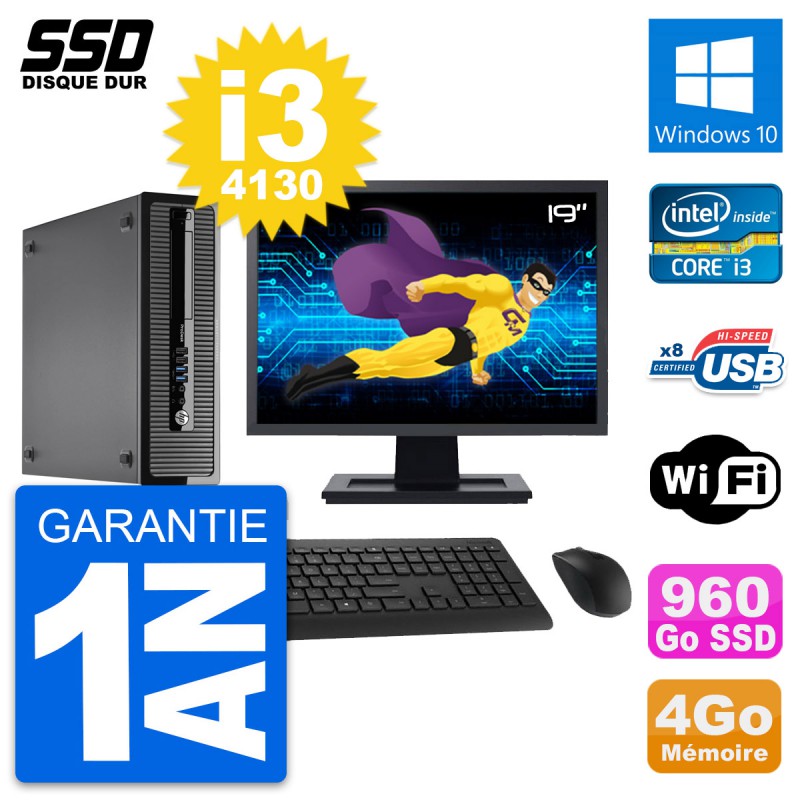 PC HP ProDesk 400 G1 SFF Ecran 19" i3-4130 RAM 4Go SSD 960Go Windows 10 Wifi