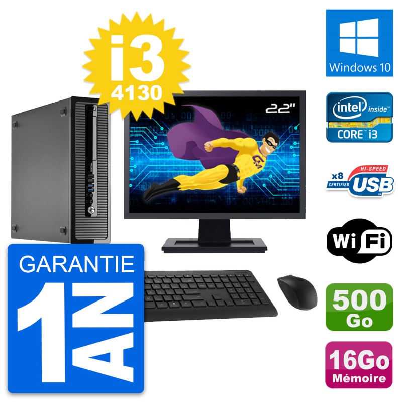 PC HP 400 G1 SFF Ecran 22" Intel i3-4130 RAM 16Go Disque 500Go Windows 10 Wifi