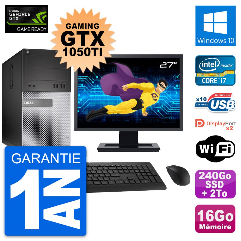 PC Tour Gaming Dell Optiplex 7020 MT - Intel i7-4790 3.6 Ghz - Nvidia GTX 1050Ti 4Go - 16 Go DDR3 - SSD 240 Go - HDD 2 To - DVD - Clef Wifi USB - Windows 10 - Livré avec Ecran 27" + clavier + souris (Marques et modèles variables) - Garantie 1 an.