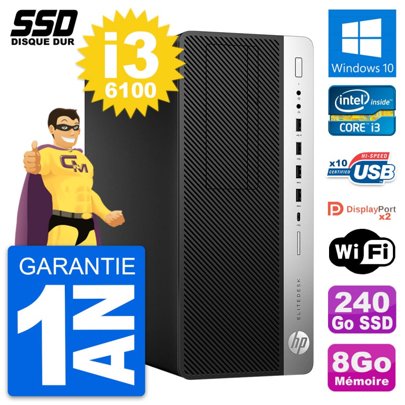 PC Tour HP EliteDesk 800 G3 MT - Intel Core i3-6100 3.7 Ghz (3 Mo) - 8 Go DDR4 - SSD 240 Go - Clef Wifi USB - Windows 10 - Garantie 1 an.