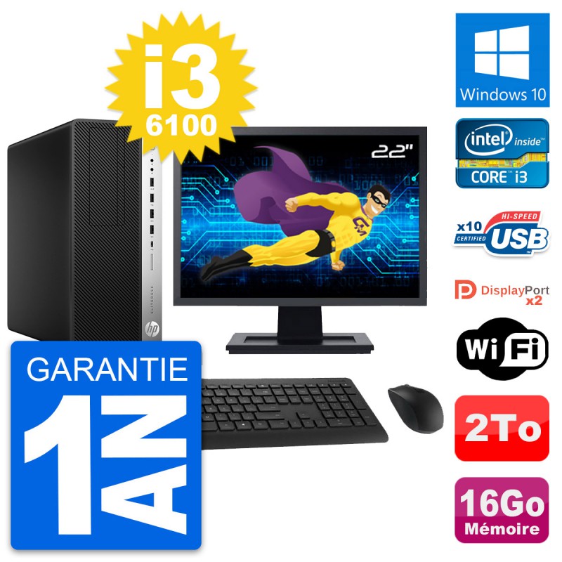 PC Tour HP EliteDesk 800 G3 MT - Intel Core i3-6100 3.7 Ghz (3 Mo) - 16 Go DDR4 - Disque Dur 3,5" 2 To - Clef Wifi USB - Windows 10 - Livré avec Ecran 22" + clavier + souris (Marques et modèles variables) - Garantie 1 an.