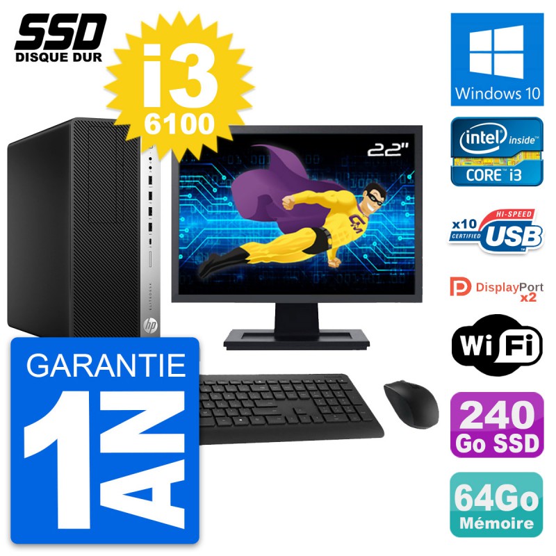 PC Tour HP EliteDesk 800 G3 MT - Intel Core i3-6100 3.7 Ghz (3 Mo) - 64 Go DDR4 - SSD 240 Go - Clef Wifi USB - Windows 10 - Livré avec Ecran 22" + clavier + souris (Marques et modèles variables) - Garantie 1 an.