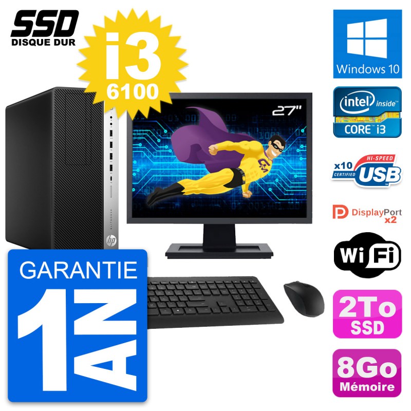 PC Tour HP EliteDesk 800 G3 MT - Intel Core i3-6100 3.7 Ghz (3 Mo) - 8 Go DDR4 - SSD 2 To - Clef Wifi USB - Windows 10 - Livré avec Ecran 27" + clavier + souris (Marques et modèles variables) - Garantie 1 an.