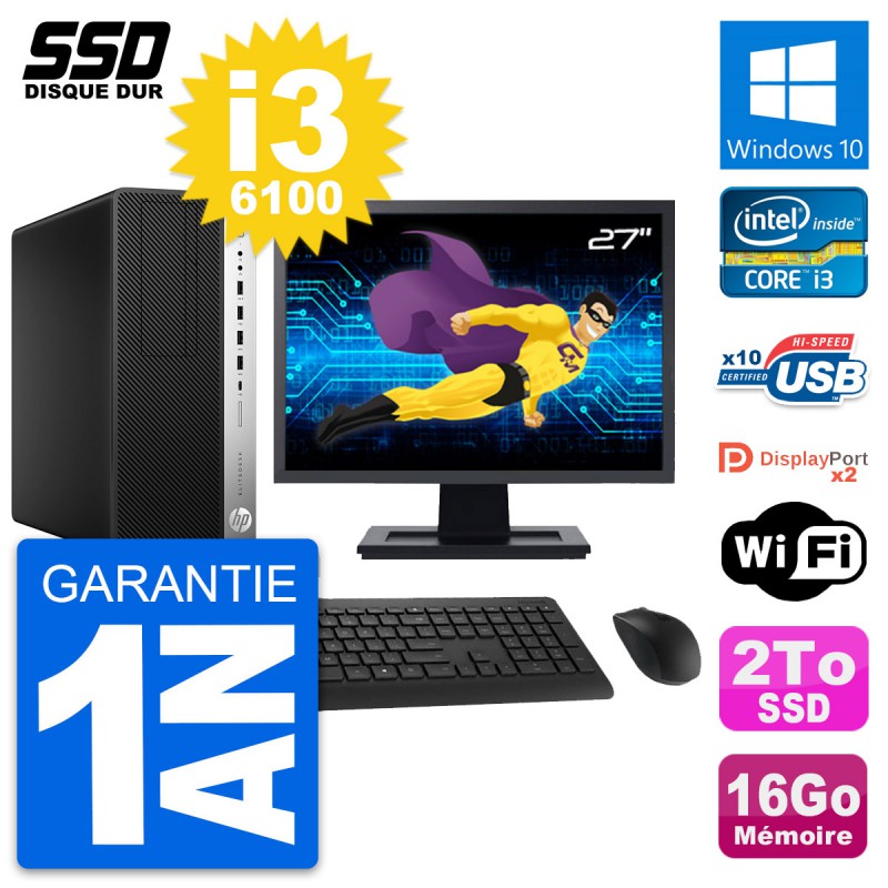 PC Tour HP EliteDesk 800 G3 MT - Intel Core i3-6100 3.7 Ghz (3 Mo) - 16 Go DDR4 - SSD 2 To - Clef Wifi USB - Windows 10 - Livré avec Ecran 27" + clavier + souris (Marques et modèles variables) - Garantie 1 an.