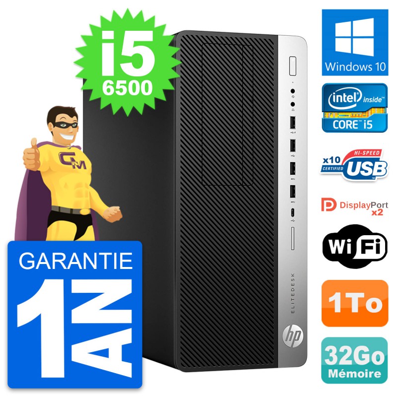 PC Tour HP EliteDesk 800 G3 MT - Intel Core i5-6500 3.2 Ghz (6 Mo) - 32 Go DDR4 - Disque Dur 3,5" 1 To - Clef Wifi USB - Windows 10 - Garantie 1 an.