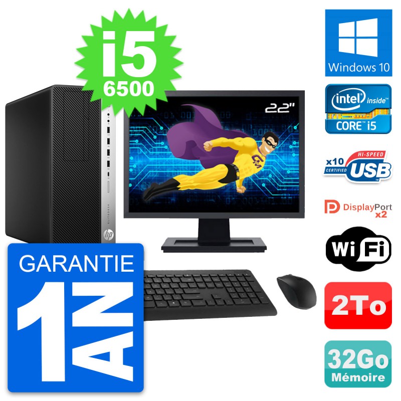 PC Tour HP EliteDesk 800 G3 MT - Intel Core i5-6500 3.2 Ghz (6 Mo) - 32 Go DDR4 - Disque Dur 3,5" 2 To - Clef Wifi USB - Windows 10 - Livré avec Ecran 22" + clavier + souris (Marques et modèles variables) - Garantie 1 an.