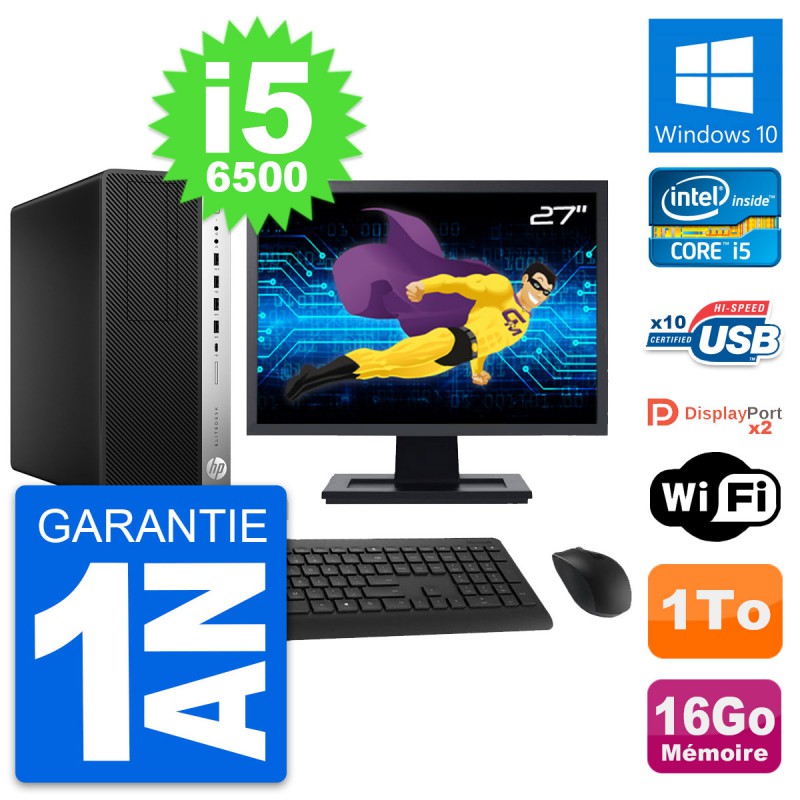 PC Tour HP EliteDesk 800 G3 MT - Intel Core i5-6500 3.2 Ghz (6 Mo) - 16 Go DDR4 - Disque Dur 3,5" 1 To - Clef Wifi USB - Windows 10 - Livré avec Ecran 27" + clavier + souris (Marques et modèles variables) - Garantie 1 an.