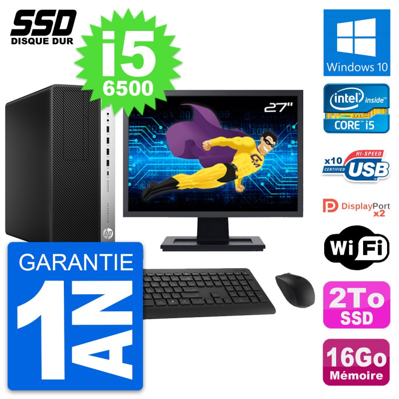 PC Tour HP EliteDesk 800 G3 MT - Intel Core i5-6500 3.2 Ghz (6 Mo) - 16 Go DDR4 - SSD 2 To - Clef Wifi USB - Windows 10 - Livré avec Ecran 27" + clavier + souris (Marques et modèles variables) - Garantie 1 an.