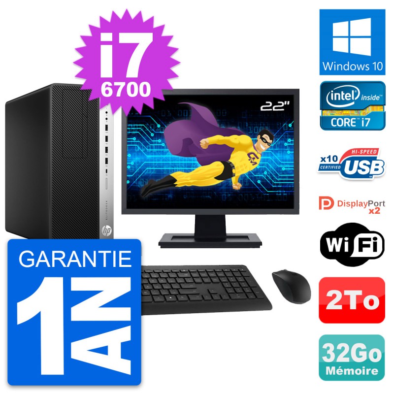 PC Tour HP EliteDesk 800 G3 MT - Intel Core i7-6700 3.4 Ghz (8 Mo) - 32 Go DDR4 - Disque Dur 3,5" 2 To - Clef Wifi USB - Windows 10 - Livré avec Ecran 22" + clavier + souris (Marques et modèles variables) - Garantie 1 an.