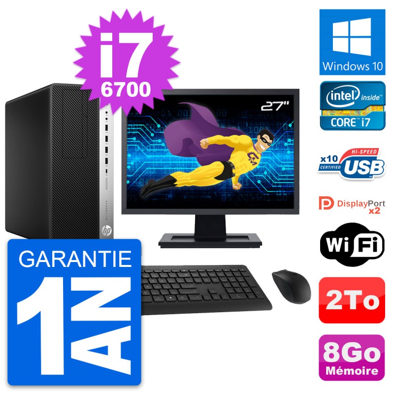 PC Tour HP EliteDesk 800 G3 MT - Intel Core i7-6700 3.4 Ghz (8 Mo) - 8 Go DDR4 - Disque Dur 3,5" 2 To - Clef Wifi USB - Windows 10 - Livré avec Ecran 27" + clavier + souris (Marques et modèles variables) - Garantie 1 an.