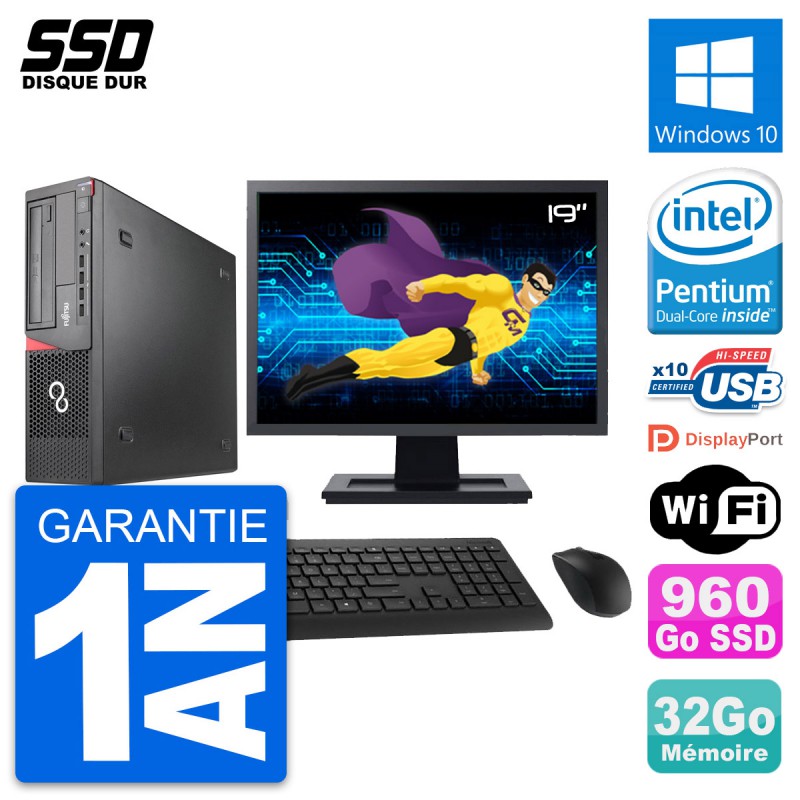 PC Fujitsu Esprimo E920 DT - Intel Pentium Dual-Core G3220 3.0 Ghz (3 Mo) - 32 Go DDR3 - SSD 960 Go - Graveur DVD - Clef Wifi USB - Windows 10 - Livré avec Ecran 19" + clavier + souris (Marques et modèles variables) - Garantie 1 an.