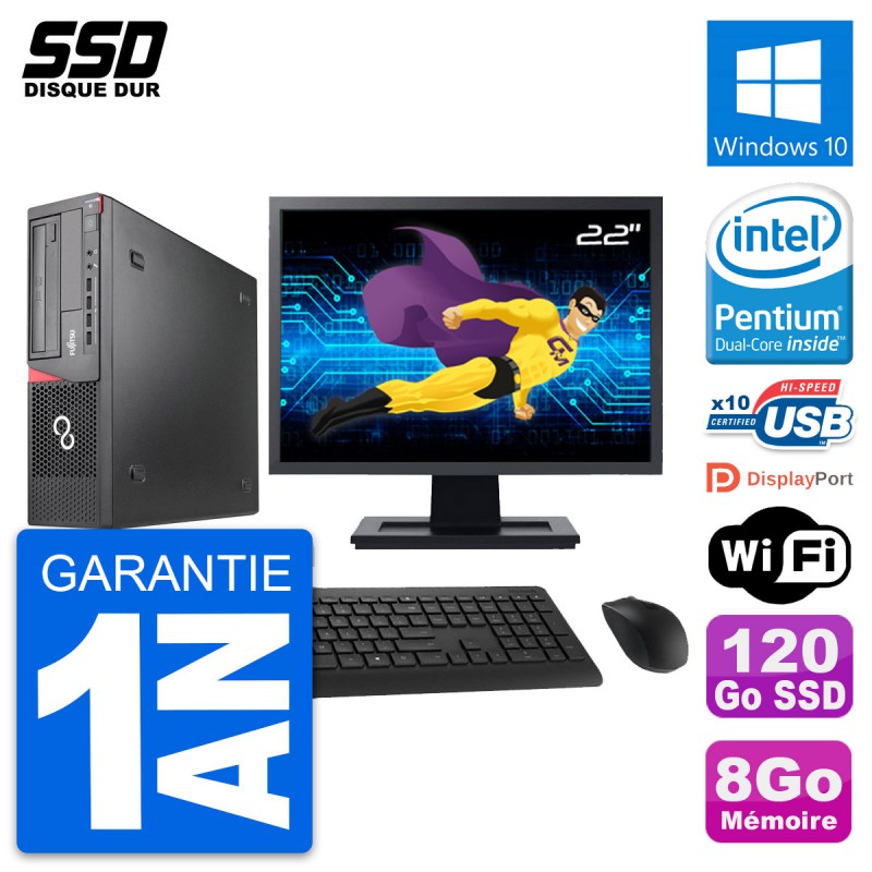 PC Fujitsu Esprimo E920 DT - Intel Pentium Dual-Core G3220 3.0 Ghz (3 Mo) - 8 Go DDR3 - SSD 120 Go - Graveur DVD - Clef Wifi USB - Windows 10 - Livré avec Ecran 22" + clavier + souris (Marques et modèles variables) - Garantie 1 an.