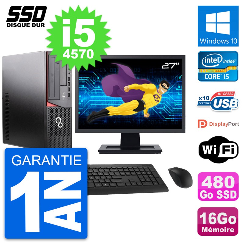 PC Fujitsu Esprimo E920 DT - Intel Core i5-4570 3.2 Ghz (6 Mo) - 16 Go DDR3 - SSD 480 Go - Graveur DVD - Clef Wifi USB - Windows 10 - Livré avec Ecran 27" + clavier + souris (Marques et modèles variables) - Garantie 1 an.