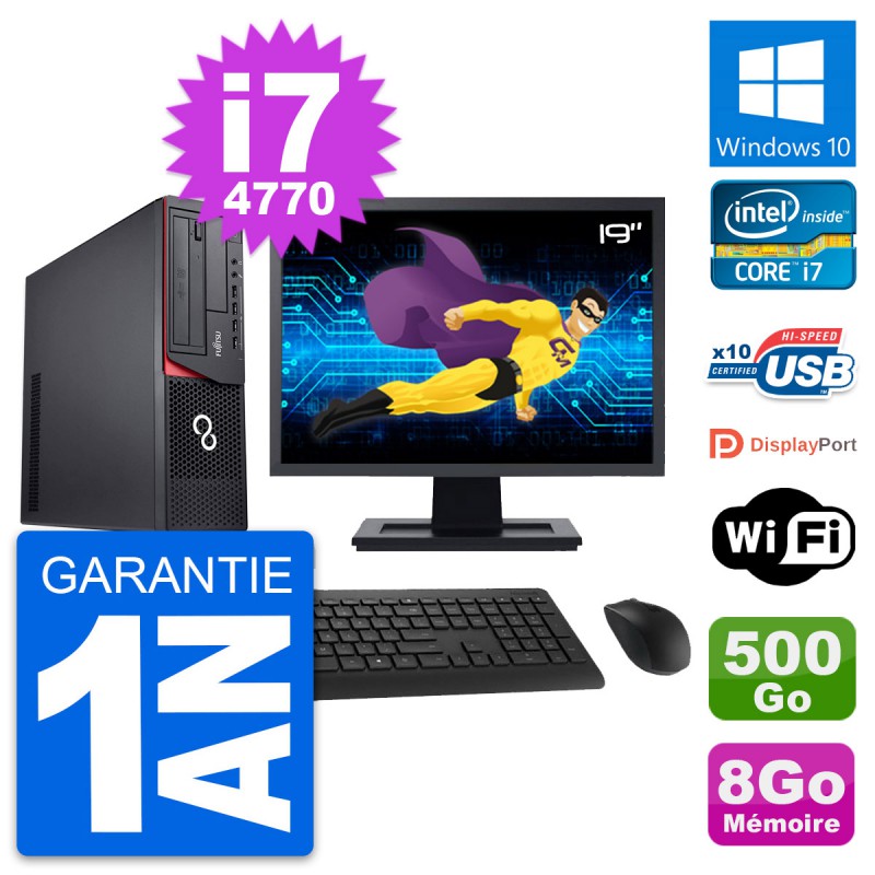 PC Fujitsu Esprimo E920 DT - Intel Core i7-4770 3.4 Ghz (8 Mo) - 8 Go DDR3 - Disque Dur 3,5" 500 Go - Graveur DVD - Clef Wifi USB - Windows 10 - Livré avec Ecran 19" + clavier + souris (Marques et modèles variables) - Garantie 1 an.