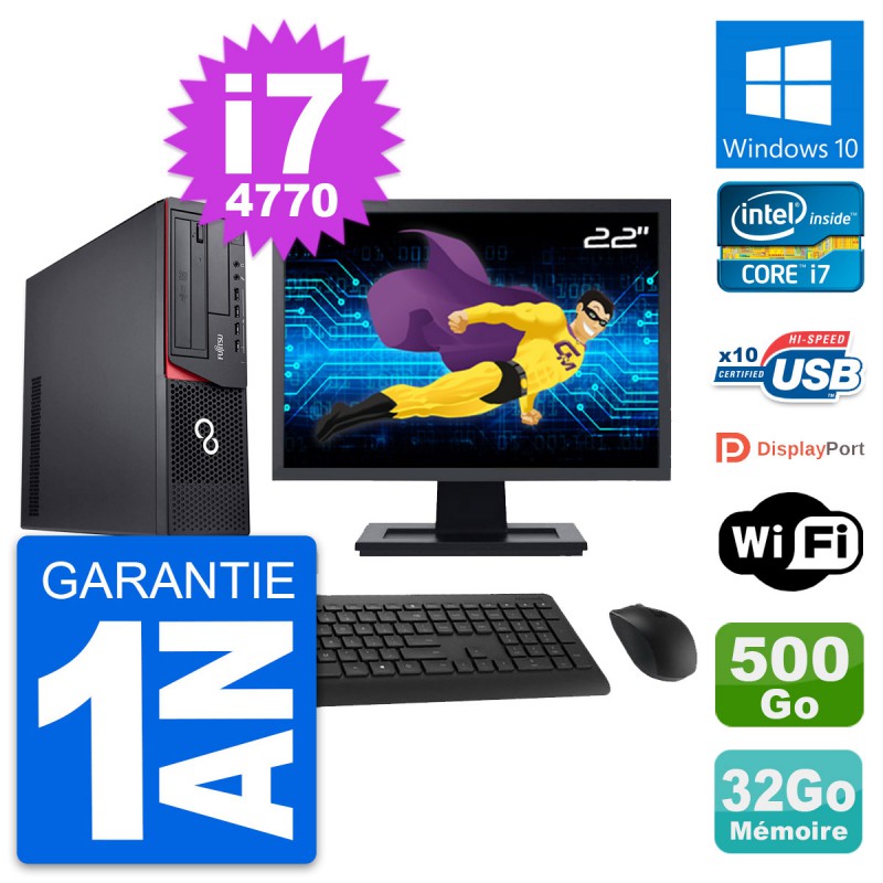 PC Fujitsu Esprimo E920 DT - Intel Core i7-4770 3.4 Ghz (8 Mo) - 32 Go DDR3 - Disque Dur 3,5" 500 Go - Graveur DVD - Clef Wifi USB - Windows 10 - Livré avec Ecran 22" + clavier + souris (Marques et modèles variables) - Garantie 1 an.