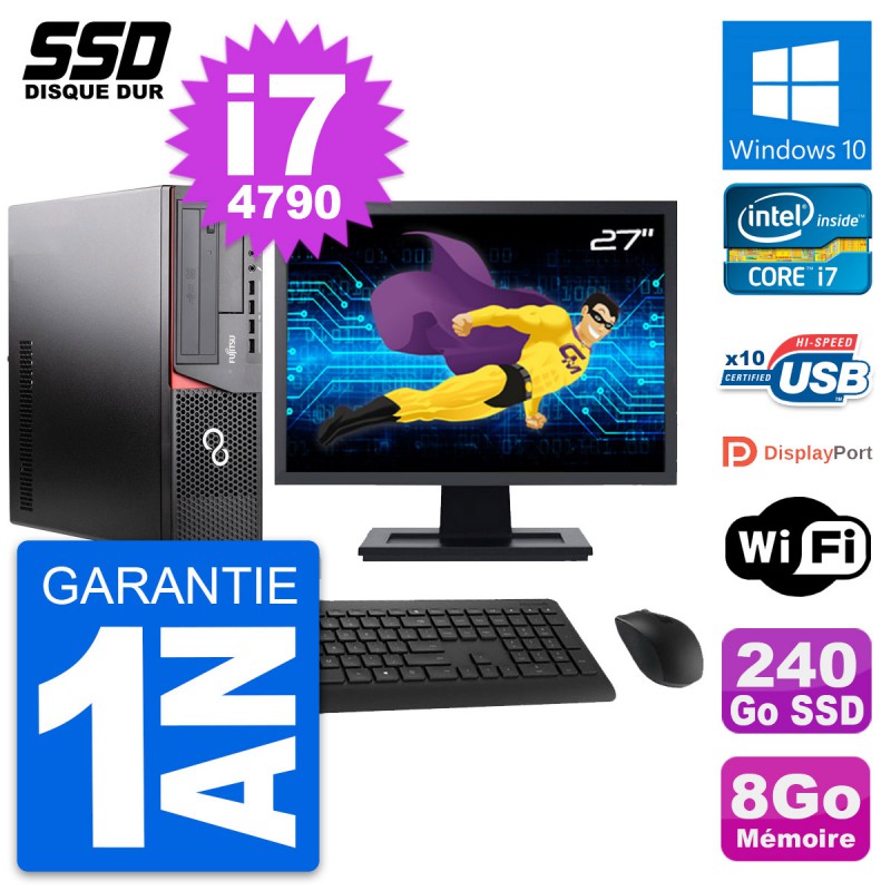 PC Fujitsu Esprimo E920 DT - Intel Core i7-4790 3.6 Ghz (8 Mo) - 8 Go DDR3 - SSD 240 Go - Graveur DVD - Clef Wifi USB - Windows 10 - Livré avec Ecran 27" + clavier + souris (Marques et modèles variables) - Garantie 1 an.