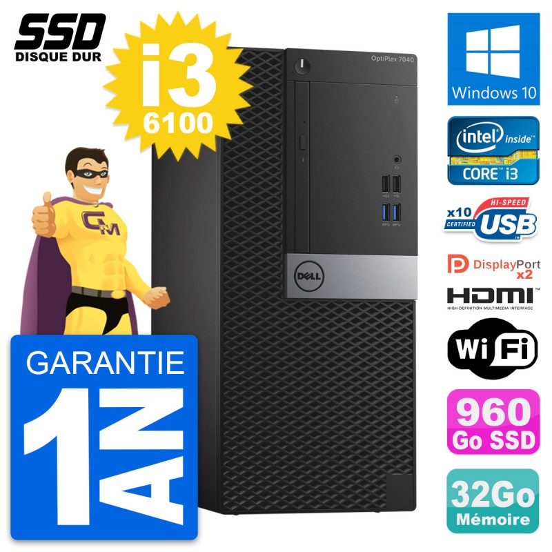 PC Tour Dell OptiPlex 7040 MT - Intel Core i3-6100 3.7 Ghz (3 Mo) - 32 Go DDR4 - SSD 960 Go - Clef Wifi USB - Graveur DVD - Windows 10 - Garantie 1 an.