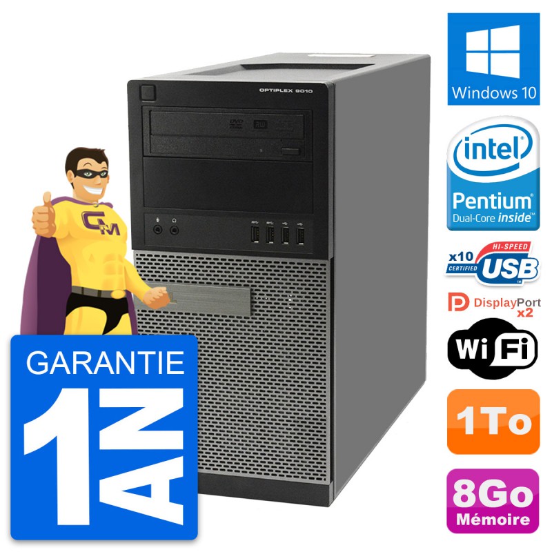 PC Tour Dell OptiPlex 9010 - Intel Pentium Dual-Core G630 2.7 Ghz (3 Mo) - 8 Go DDR3 - Disque Dur 3,5" 1 To - Graveur DVD - Clef Wifi USB - Windows 10 - Garantie 1 an.