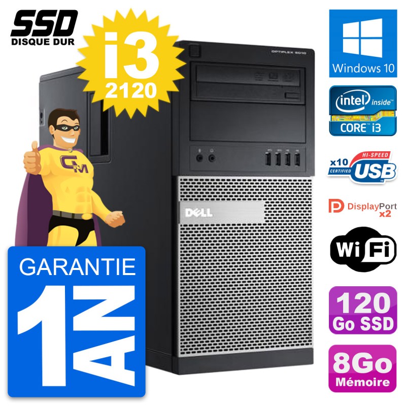 PC Tour Dell OptiPlex 9010 - Intel Core i3-2120 3.3 Ghz (3 Mo) - 8 Go DDR3 - SSD 120 Go - Graveur DVD - Clef Wifi USB - Windows 10 - Garantie 1 an.