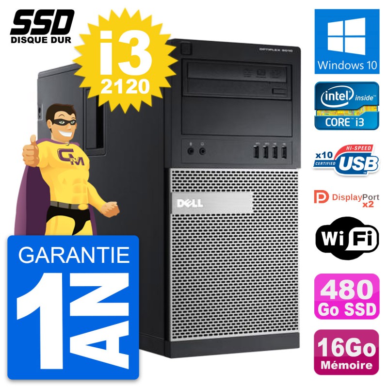 PC Tour Dell OptiPlex 9010 - Intel Core i3-2120 3.3 Ghz (3 Mo) - 16 Go DDR3 - SSD 480 Go - Graveur DVD - Clef Wifi USB - Windows 10 - Garantie 1 an.