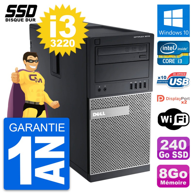 PC Tour Dell OptiPlex 9010 - Intel Core i3-3220 3.3 Ghz (3 Mo) - 8 Go DDR3 - SSD 240 Go - Graveur DVD - Clef Wifi USB - Windows 10 - Garantie 1 an.