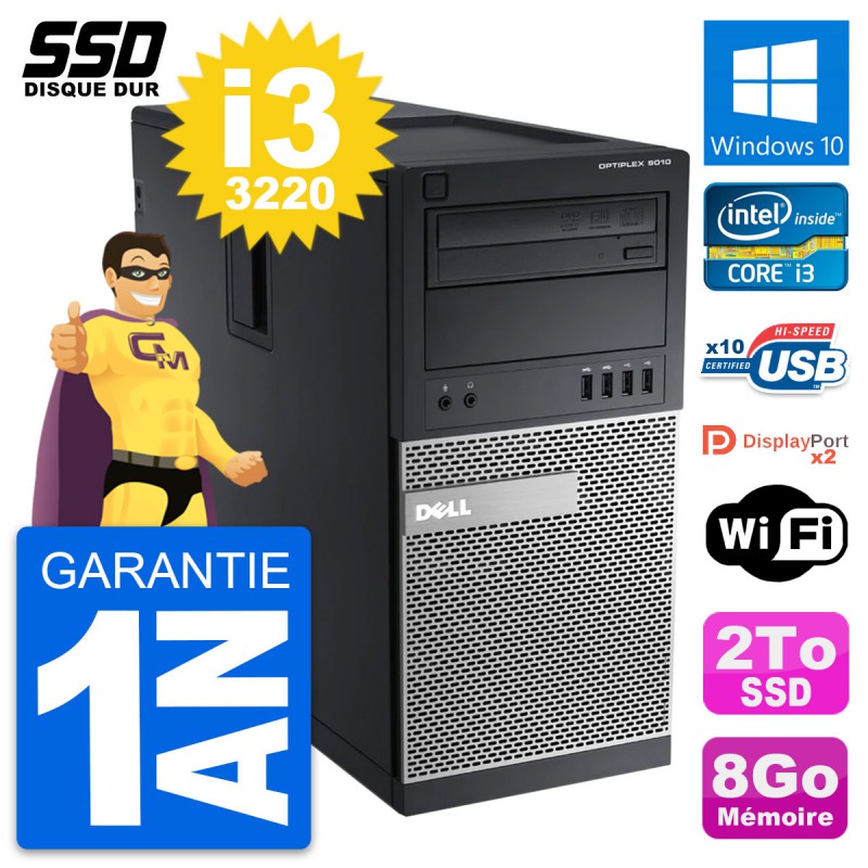 PC Tour Dell OptiPlex 9010 - Intel Core i3-3220 3.3 Ghz (3 Mo) - 8 Go DDR3 - SSD 2 To - Graveur DVD - Clef Wifi USB - Windows 10 - Garantie 1 an.