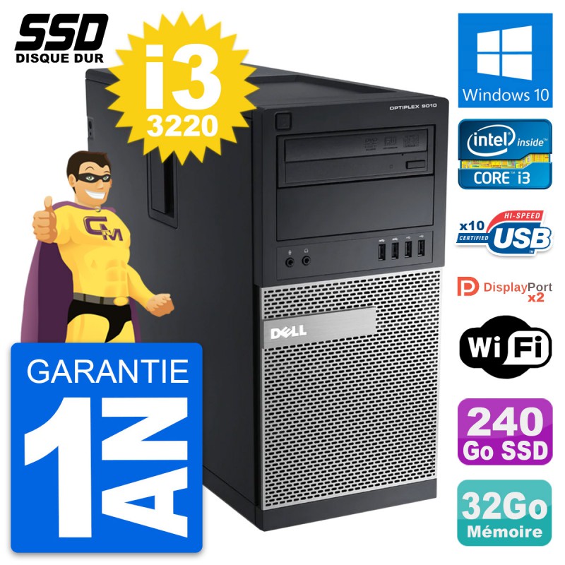 PC Tour Dell OptiPlex 9010 - Intel Core i3-3220 3.3 Ghz (3 Mo) - 32 Go DDR3 - SSD 240 Go - Graveur DVD - Clef Wifi USB - Windows 10 - Garantie 1 an.