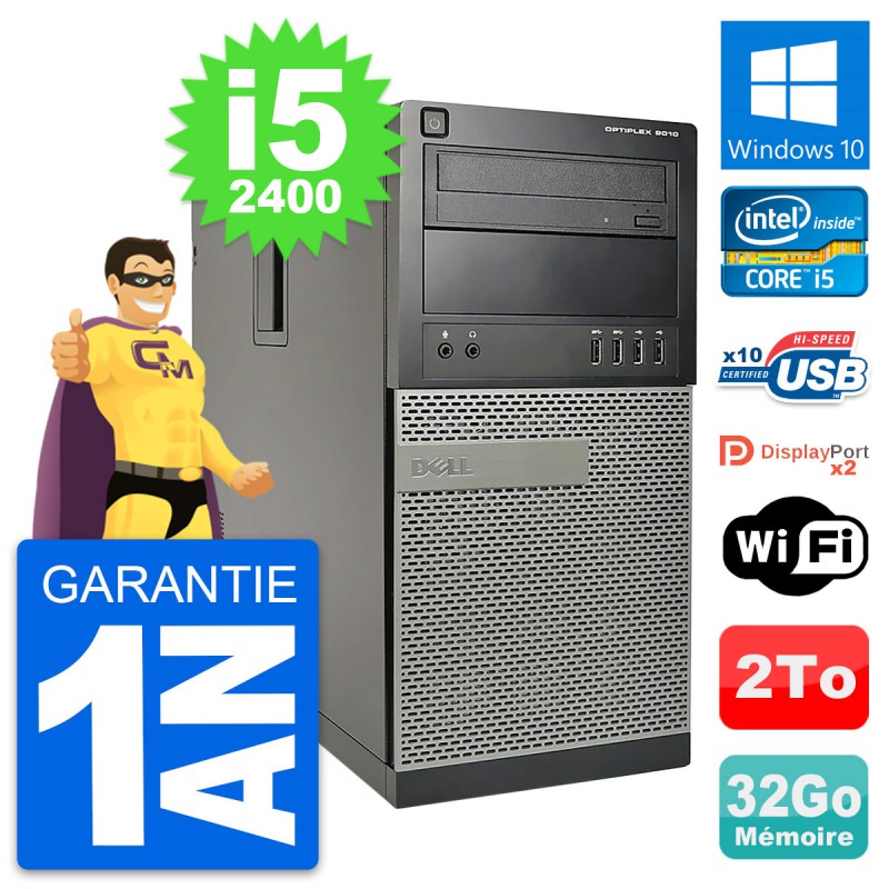 PC Tour Dell OptiPlex 9010 - Intel Core i5-2400 3.1 Ghz (6 Mo) - 32 Go DDR3 - Disque Dur 3,5" 2 To - Graveur DVD - Clef Wifi USB - Windows 10 - Garantie 1 an.