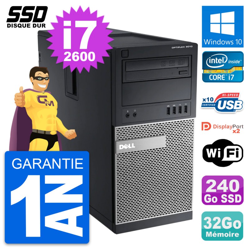 PC Tour Dell OptiPlex 9010 - Intel Core i7-2600 3.4 Ghz (8 Mo) - 32 Go DDR3 - SSD 240 Go - Graveur DVD - Clef Wifi USB - Windows 10 - Garantie 1 an.