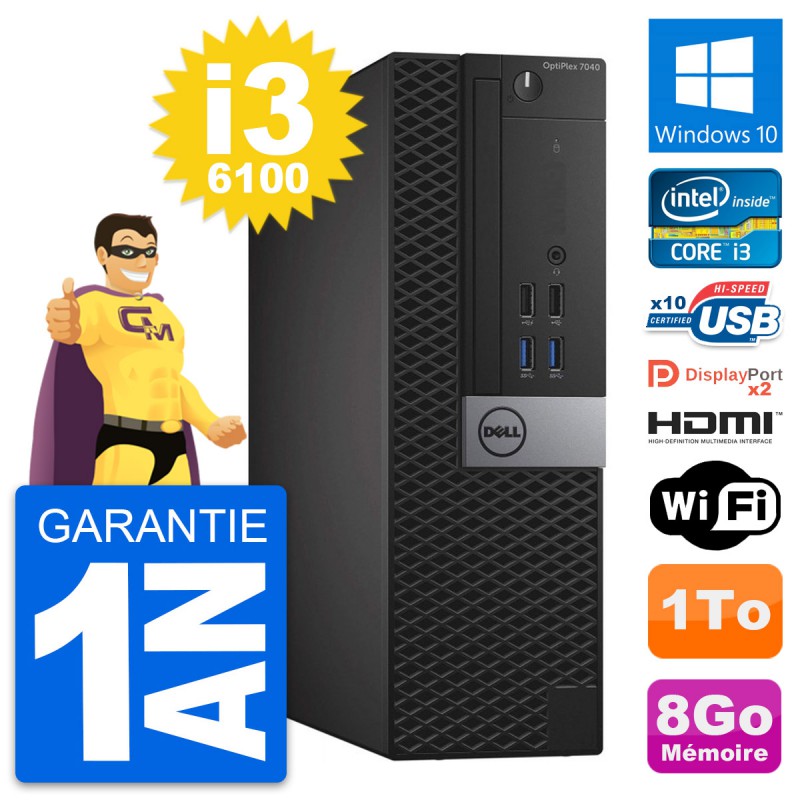 PC Dell OptiPlex 7040 SFF - Intel Core i3-6100 3.7 Ghz (3 Mo) - 8 Go DDR4 - Disque Dur 3,5" 1 To - Clef Wifi USB - Windows 10 - Garantie 1 an.