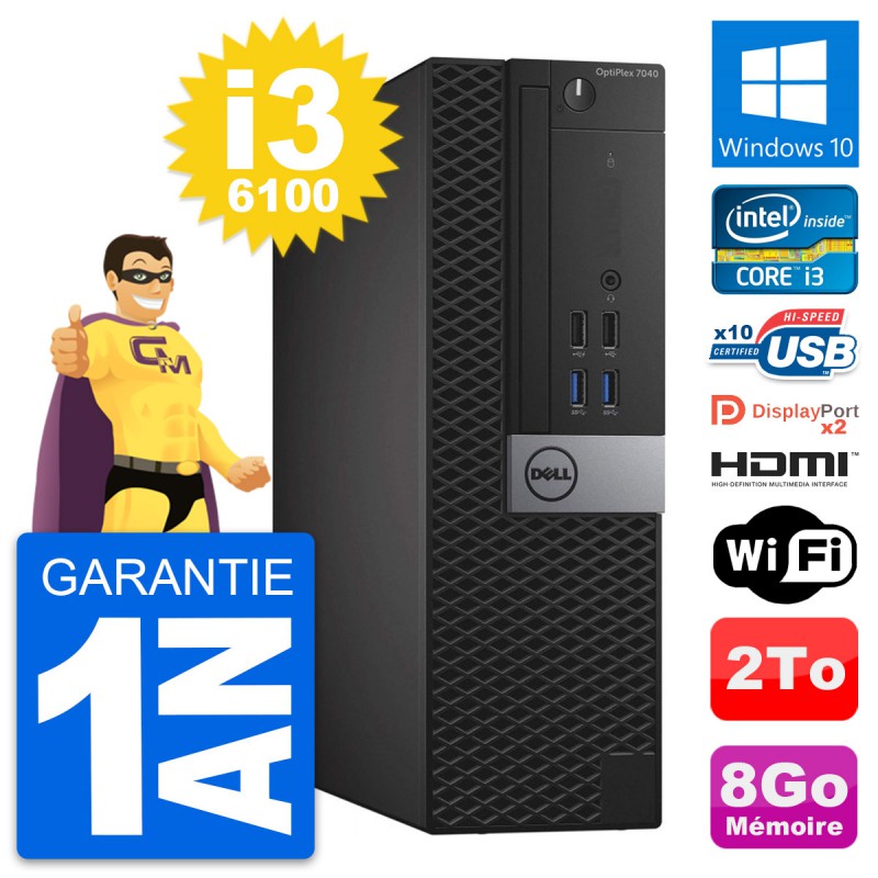 PC Dell OptiPlex 7040 SFF - Intel Core i3-6100 3.7 Ghz (3 Mo) - 8 Go DDR4 - Disque Dur 3,5" 2 To - Clef Wifi USB - Windows 10 - Garantie 1 an.