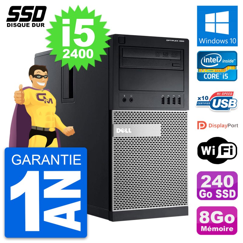 PC Tour Dell OptiPlex 990 - Intel Core i5-2400 3.1 Ghz (6 Mo) - 8 Go DDR3 - SSD 240 Go - Graveur DVD - Clef Wifi USB - Windows 10 - Garantie 1 an.