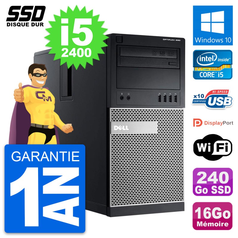 PC Tour Dell OptiPlex 990 - Intel Core i5-2400 3.1 Ghz (6 Mo) - 16 Go DDR3 - SSD 240 Go - Graveur DVD - Clef Wifi USB - Windows 10 - Garantie 1 an.