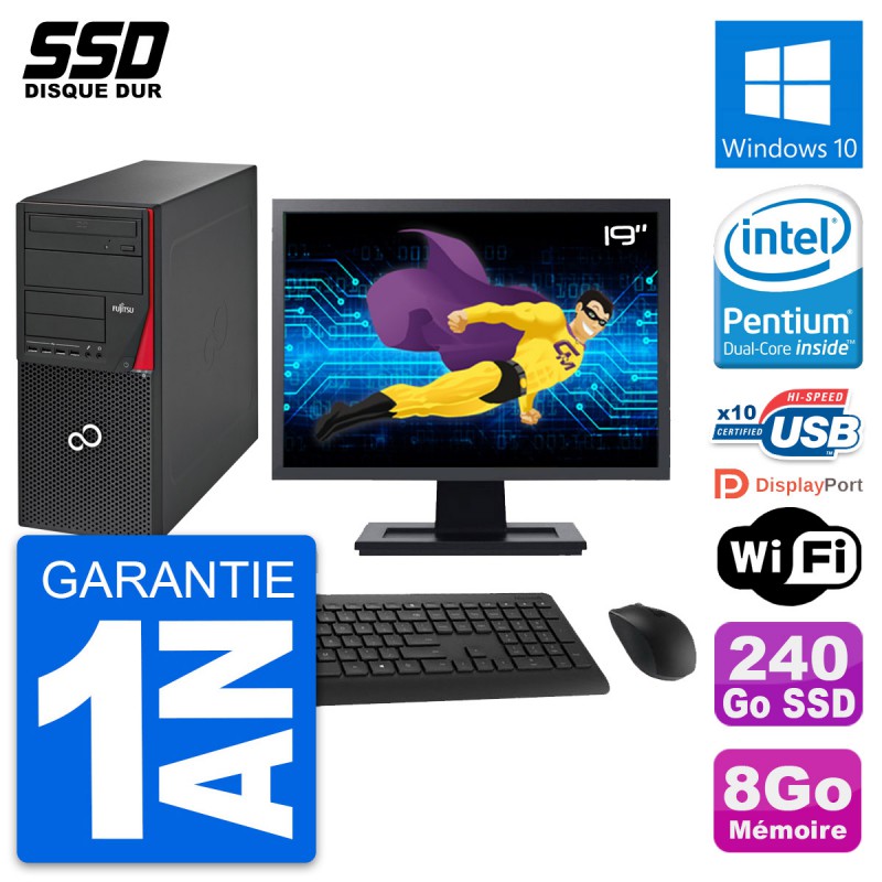 PC Tour Fujitsu Esprimo P720 - Intel Pentium Dual-Core G3220 3.0 Ghz (3 Mo) - 8 Go DDR3 - SSD 240 Go - Graveur DVD - Clef Wifi USB - Windows 10 - Livré avec Ecran 19" + clavier + souris (Marques et modèles variables) - Garantie 1 an.
