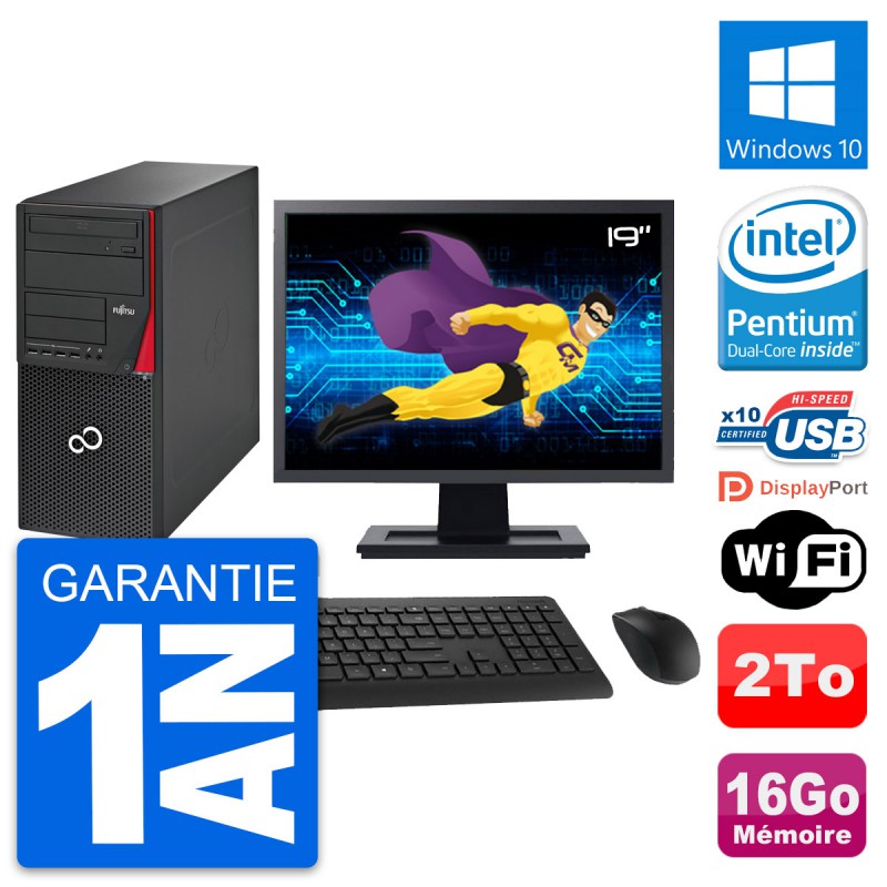 PC Tour Fujitsu Esprimo P720 - Intel Pentium Dual-Core G3220 3.0 Ghz (3 Mo) - 16 Go DDR3 - Disque Dur 3,5" 2 To - Graveur DVD - Clef Wifi USB - Windows 10 - Livré avec Ecran 19" + clavier + souris (Marques et modèles variables) - Garantie 1 an.