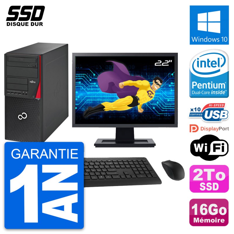 PC Tour Fujitsu Esprimo P720 - Intel Pentium Dual-Core G3220 3.0 Ghz (3 Mo) - 16 Go DDR3 - SSD 2 To - Graveur DVD - Clef Wifi USB - Windows 10 - Livré avec Ecran 22" + clavier + souris (Marques et modèles variables) - Garantie 1 an.