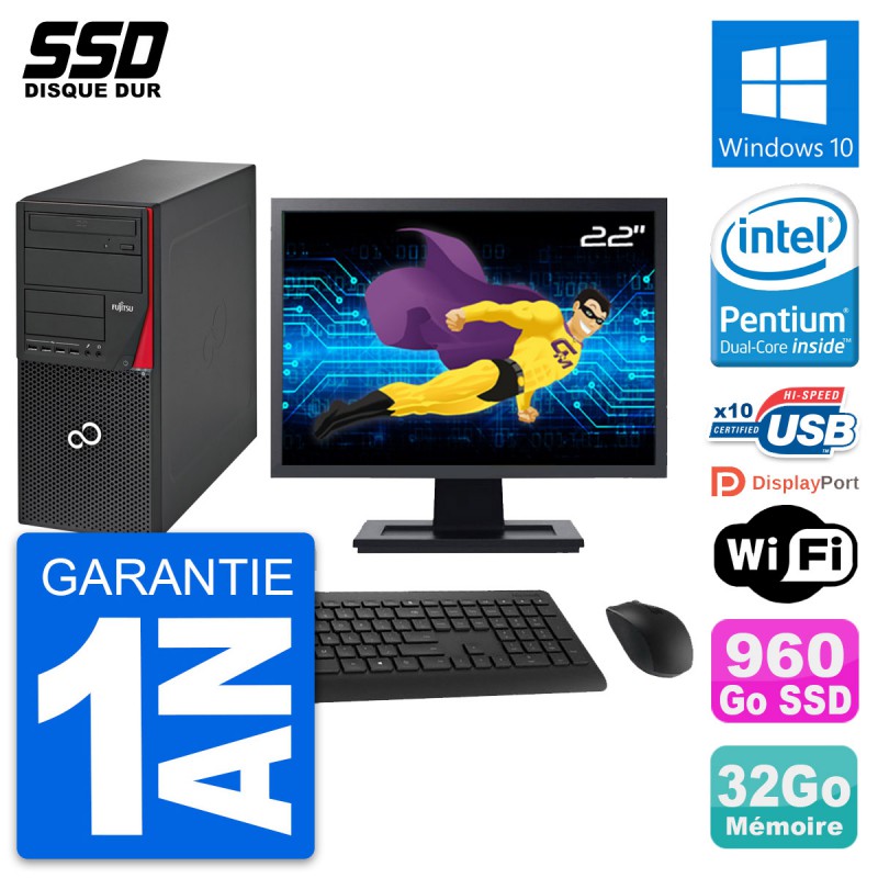 PC Tour Fujitsu Esprimo P720 - Intel Pentium Dual-Core G3220 3.0 Ghz (3 Mo) - 32 Go DDR3 - SSD 960 Go - Graveur DVD - Clef Wifi USB - Windows 10 - Livré avec Ecran 22" + clavier + souris (Marques et modèles variables) - Garantie 1 an.