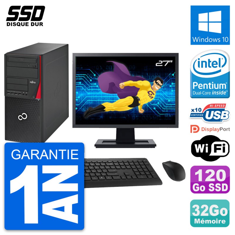 PC Tour Fujitsu Esprimo P720 - Intel Pentium Dual-Core G3220 3.0 Ghz (3 Mo) - 32 Go DDR3 - SSD 120 Go - Graveur DVD - Clef Wifi USB - Windows 10 - Livré avec Ecran 27" + clavier + souris (Marques et modèles variables) - Garantie 1 an.
