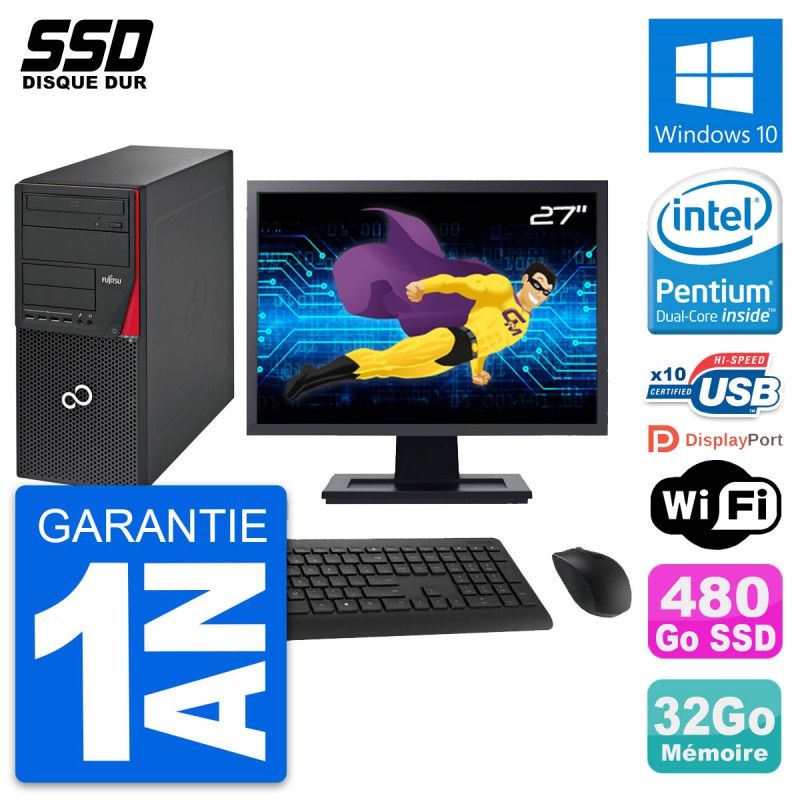 PC Tour Fujitsu Esprimo P720 - Intel Pentium Dual-Core G3220 3.0 Ghz (3 Mo) - 32 Go DDR3 - SSD 480 Go - Graveur DVD - Clef Wifi USB - Windows 10 - Livré avec Ecran 27" + clavier + souris (Marques et modèles variables) - Garantie 1 an.