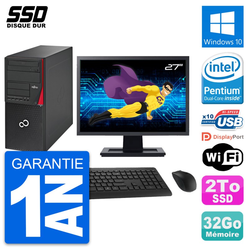 PC Tour Fujitsu Esprimo P720 - Intel Pentium Dual-Core G3220 3.0 Ghz (3 Mo) - 32 Go DDR3 - SSD 2 To - Graveur DVD - Clef Wifi USB - Windows 10 - Livré avec Ecran 27" + clavier + souris (Marques et modèles variables) - Garantie 1 an.