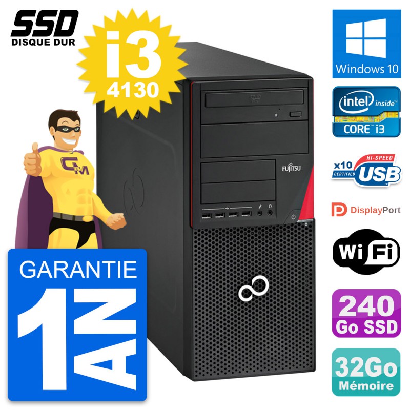 PC Tour Fujitsu Esprimo P720 - Intel Core i3-4130 3.4 Ghz (3 Mo) - 32 Go DDR3 - SSD 240 Go - Graveur DVD - Clef Wifi USB - Windows 10 - Garantie 1 an.