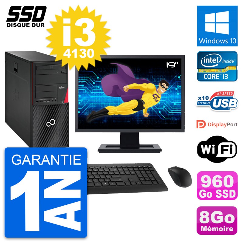 PC Tour Fujitsu Esprimo P720 - Intel Core i3-4130 3.4 Ghz (3 Mo) - 8 Go DDR3 - SSD 960 Go - Graveur DVD - Clef Wifi USB - Windows 10 - Livré avec Ecran 19" + clavier + souris (Marques et modèles variables) - Garantie 1 an.