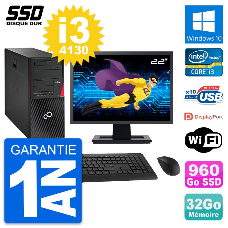 PC Tour Fujitsu Esprimo P720 - Intel Core i3-4130 3.4 Ghz (3 Mo) - 32 Go DDR3 - SSD 960 Go - Graveur DVD - Clef Wifi USB - Windows 10 - Livré avec Ecran 22" + clavier + souris (Marques et modèles variables) - Garantie 1 an.