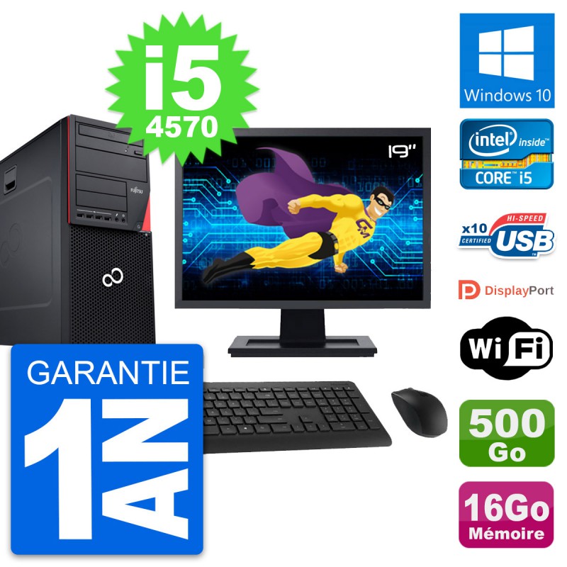 PC Tour Fujitsu Esprimo P720 - Intel Core i5-4570 3.2 Ghz (6 Mo) - 16 Go DDR3 - Disque Dur 3,5" 500 Go - Graveur DVD - Clef Wifi USB - Windows 10 - Livré avec Ecran 19" + clavier + souris (Marques et modèles variables) - Garantie 1 an.