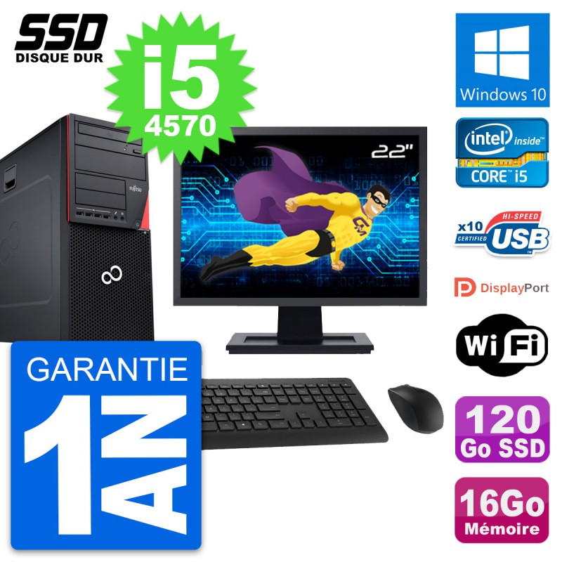PC Tour Fujitsu Esprimo P720 - Intel Core i5-4570 3.2 Ghz (6 Mo) - 16 Go DDR3 - SSD 120 Go - Graveur DVD - Clef Wifi USB - Windows 10 - Livré avec Ecran 22" + clavier + souris (Marques et modèles variables) - Garantie 1 an.