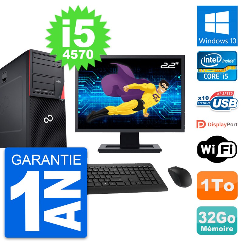 PC Tour Fujitsu Esprimo P720 - Intel Core i5-4570 3.2 Ghz (6 Mo) - 32 Go DDR3 - Disque Dur 3,5" 1 To - Graveur DVD - Clef Wifi USB - Windows 10 - Livré avec Ecran 22" + clavier + souris (Marques et modèles variables) - Garantie 1 an.