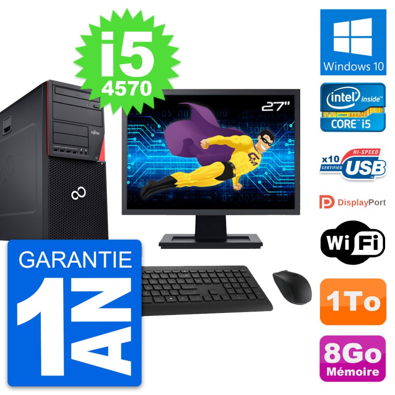 PC Tour Fujitsu Esprimo P720 - Intel Core i5-4570 3.2 Ghz (6 Mo) - 8 Go DDR3 - Disque Dur 3,5" 1 To - Graveur DVD - Clef Wifi USB - Windows 10 - Livré avec Ecran 27" + clavier + souris (Marques et modèles variables) - Garantie 1 an.