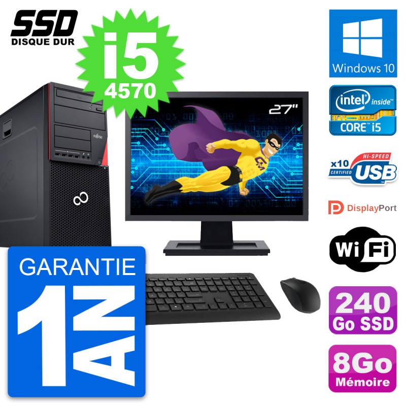 PC Tour Fujitsu Esprimo P720 - Intel Core i5-4570 3.2 Ghz (6 Mo) - 8 Go DDR3 - SSD 240 Go - Graveur DVD - Clef Wifi USB - Windows 10 - Livré avec Ecran 27" + clavier + souris (Marques et modèles variables) - Garantie 1 an.